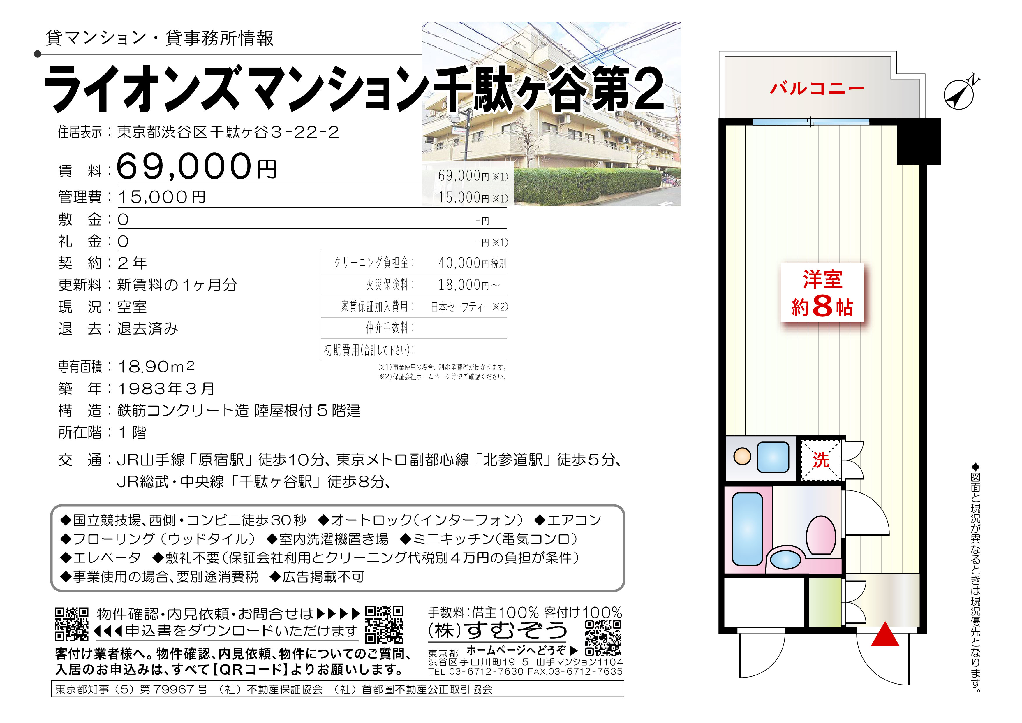 間取り:1R 専有面積:18.90㎡ 築年月:1983年03月 賃料:6.9万円