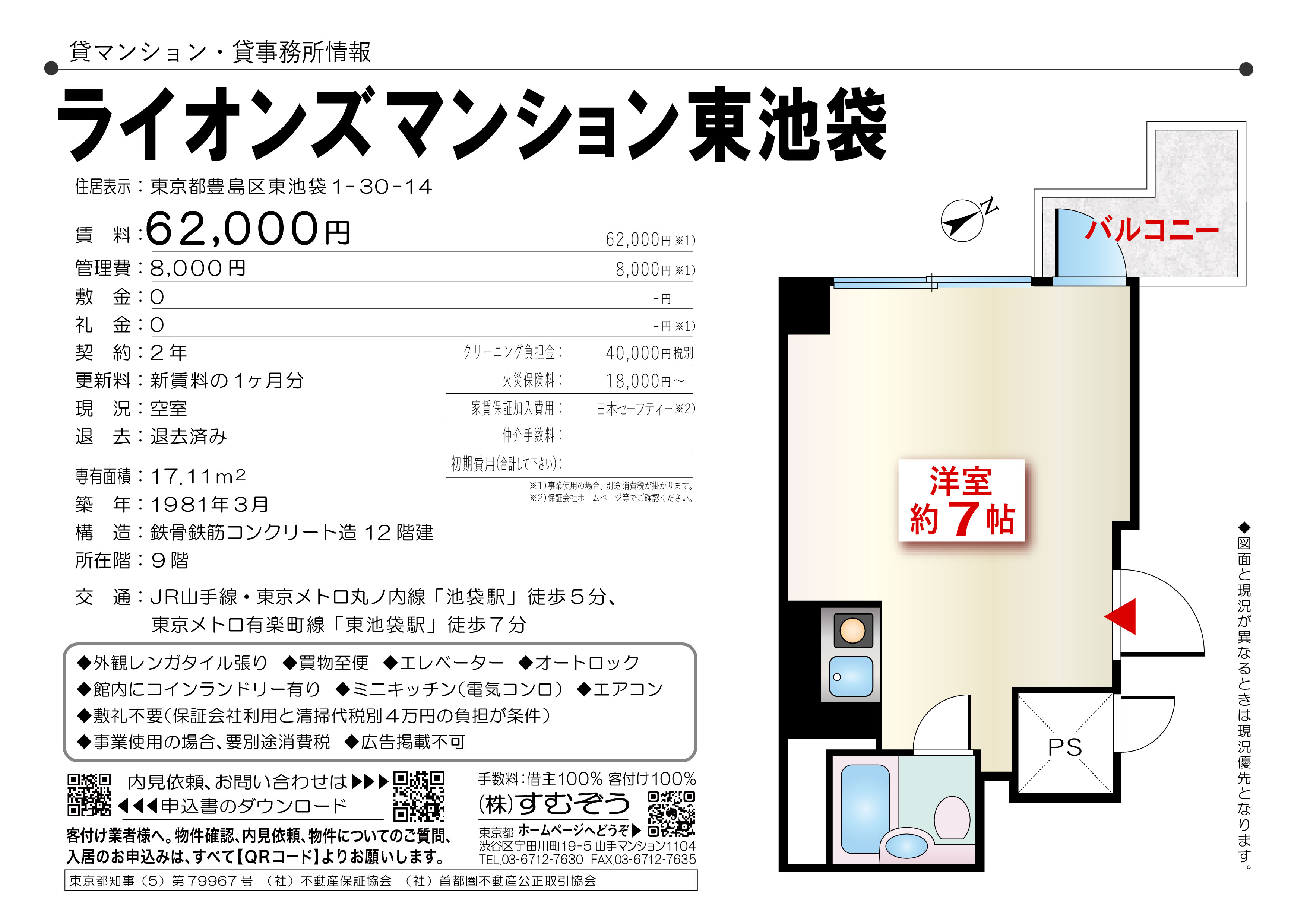 貸マンション・貸事務所 池袋駅 ライオンズマンション東池袋