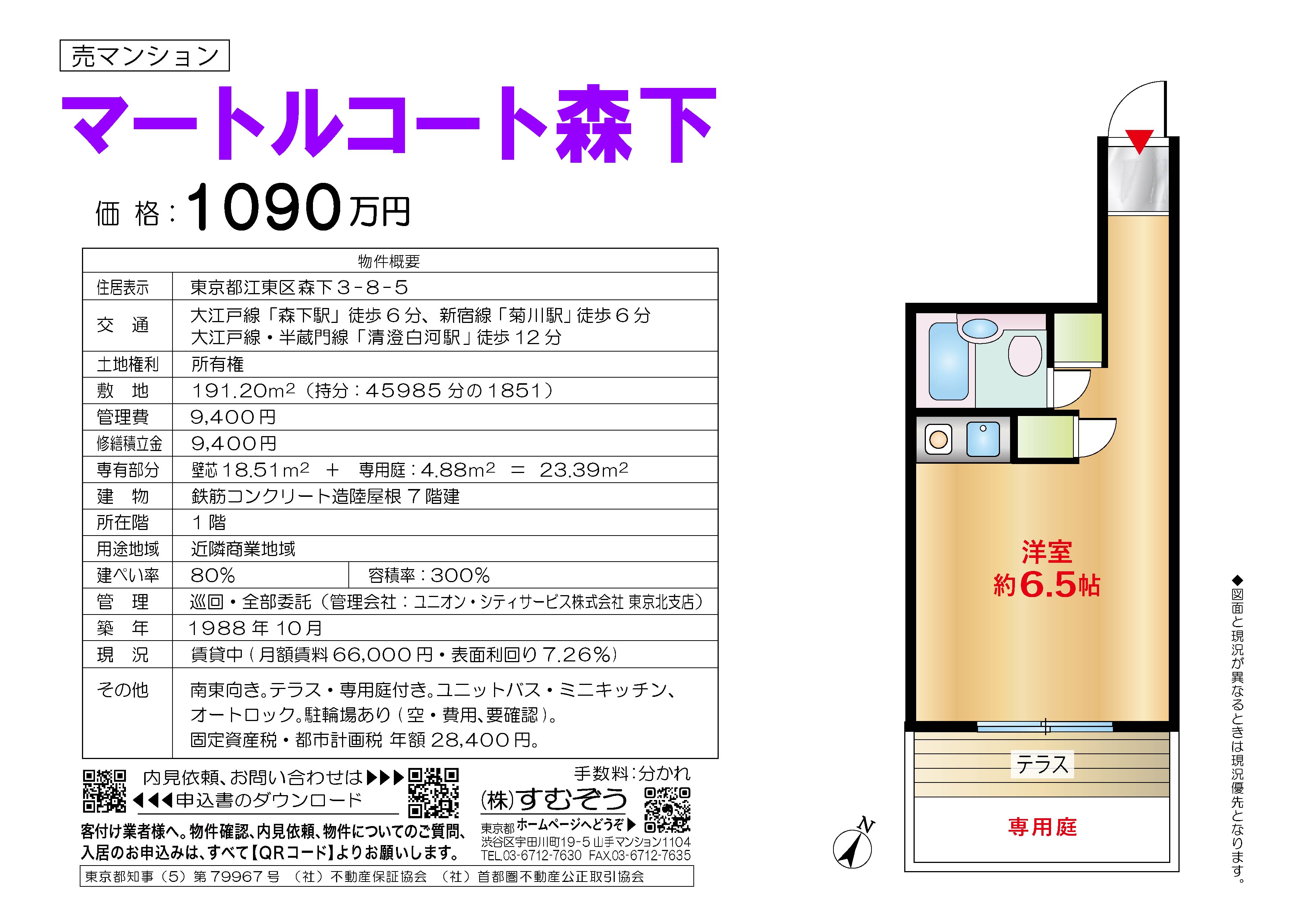 間取り:1R 専有面積:壁芯18.51㎡+専用庭4.88㎡=23.39㎡ 築年月:1988年10月 価格:1,090万円