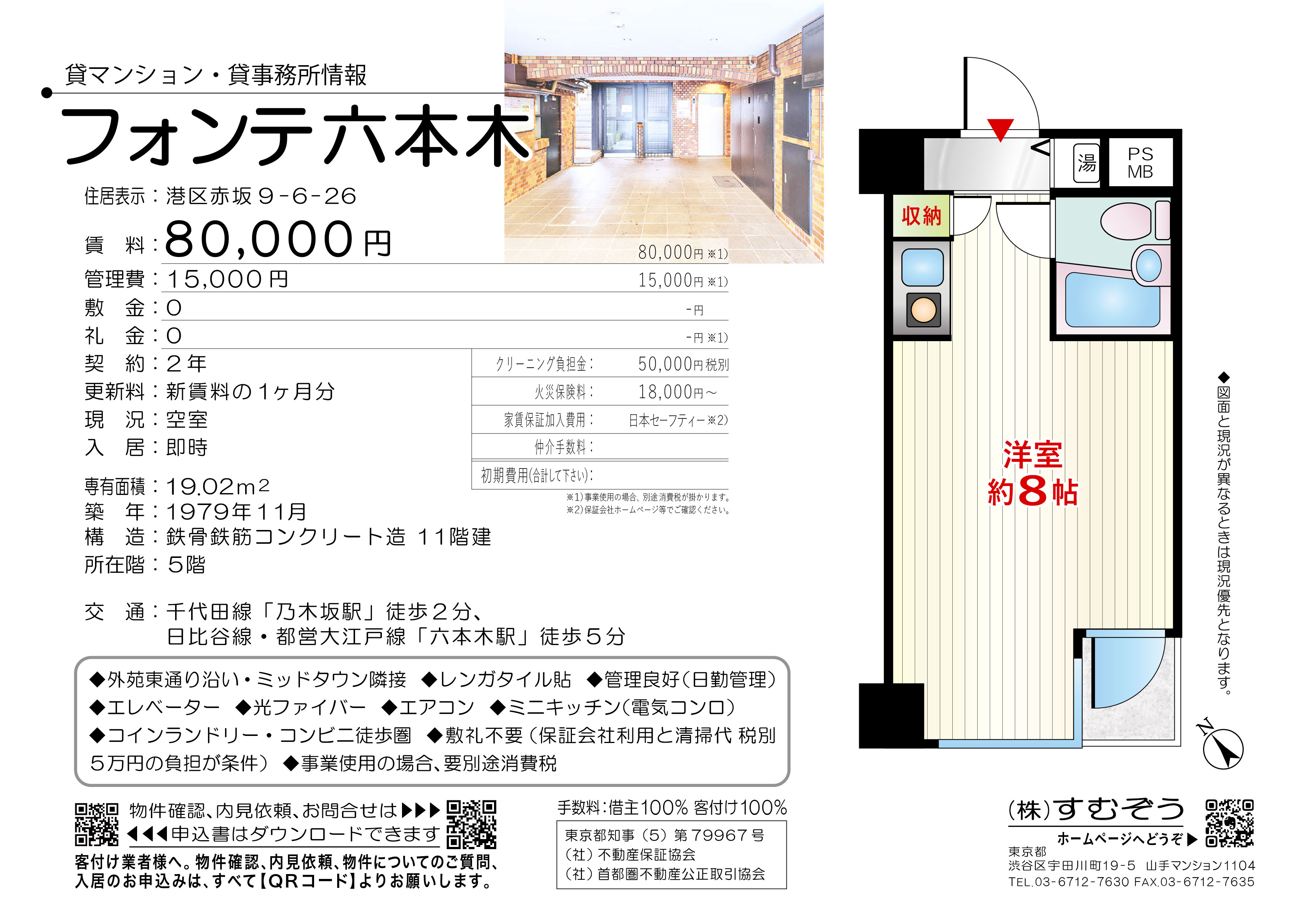 間取り:1R 専有面積:19.02㎡ 築年月:1979年11月 賃料:8万円