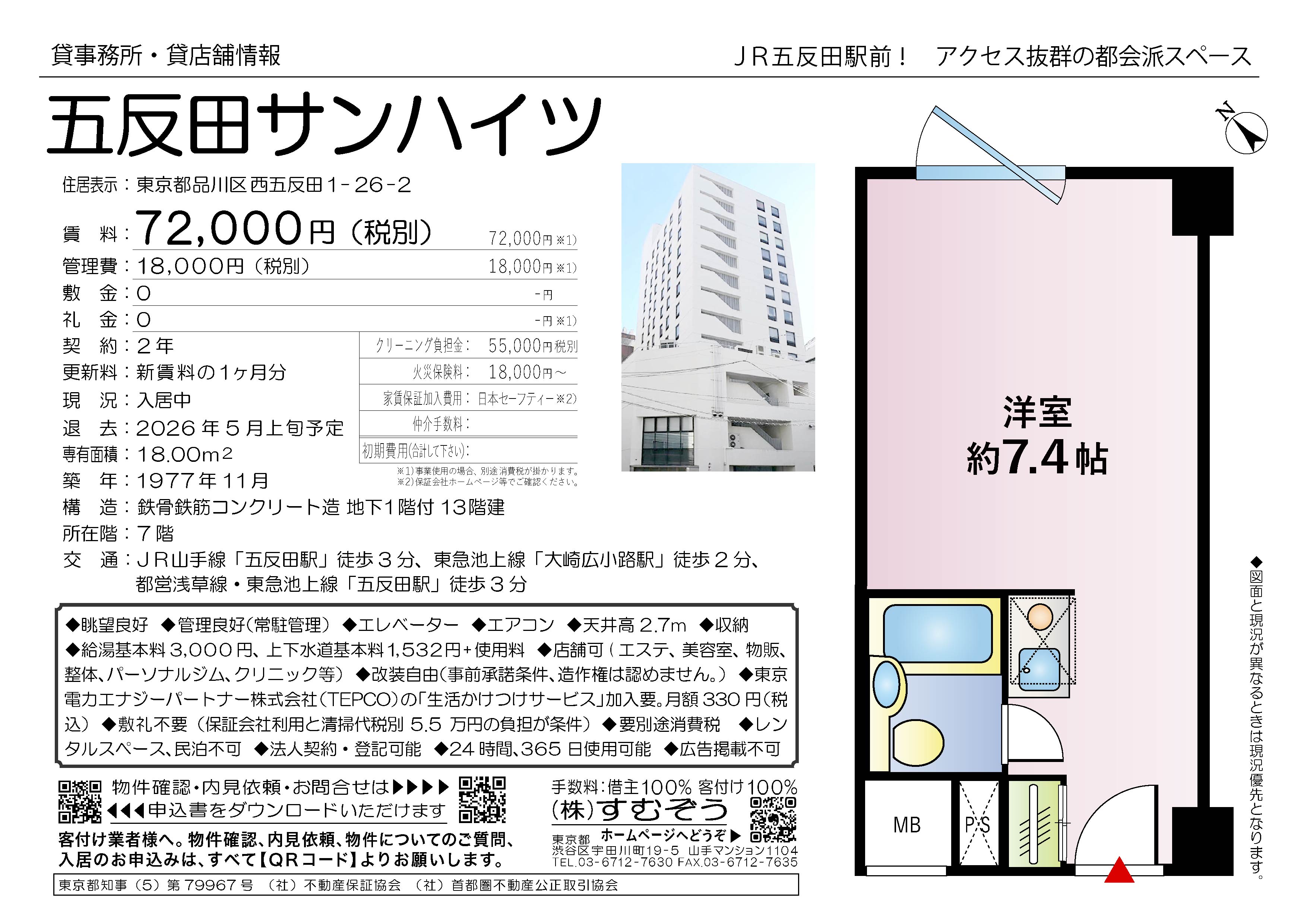 | 建物 | 鉄骨鉄筋コンクリート造地下1階付13階建 7階部分 18.00㎡ 1977年11月 洋7.4 |