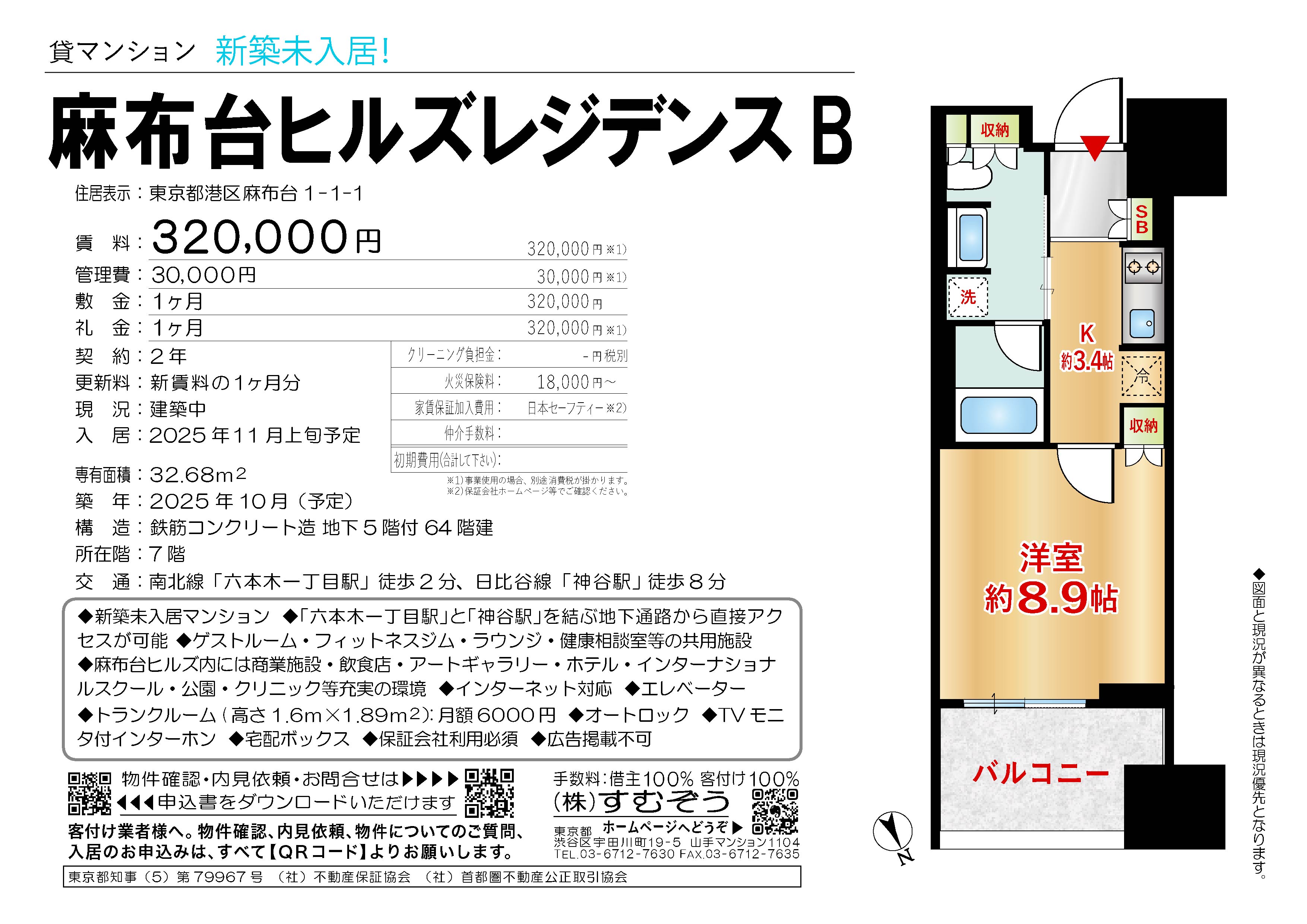 間取り:1K 専有面積:32.68㎡ 築年月:2025年10月(予定) 賃料:32万円