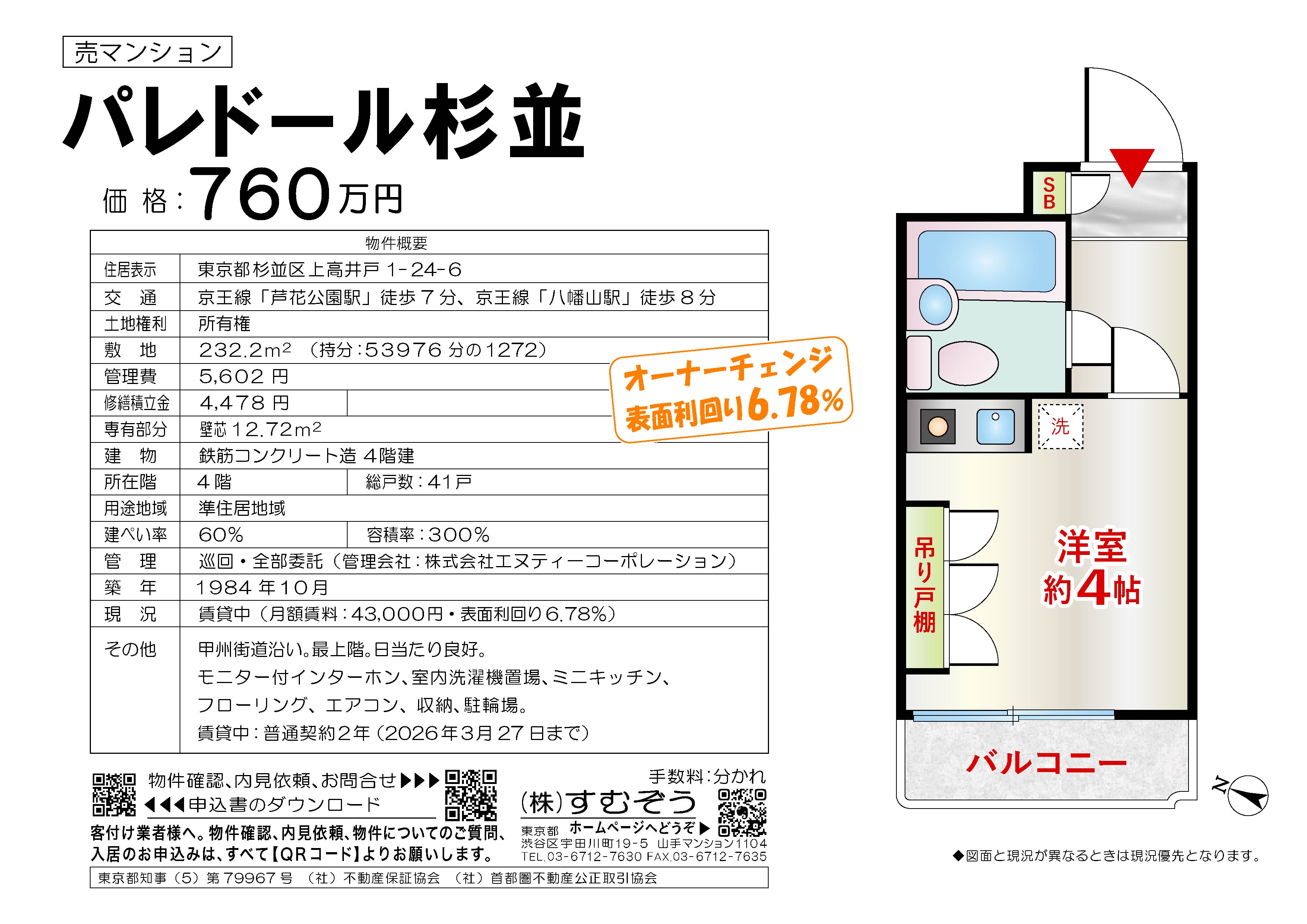 間取り:1R 専有面積:壁芯12.72㎡ 築年月:1984年10月 価格:760万円