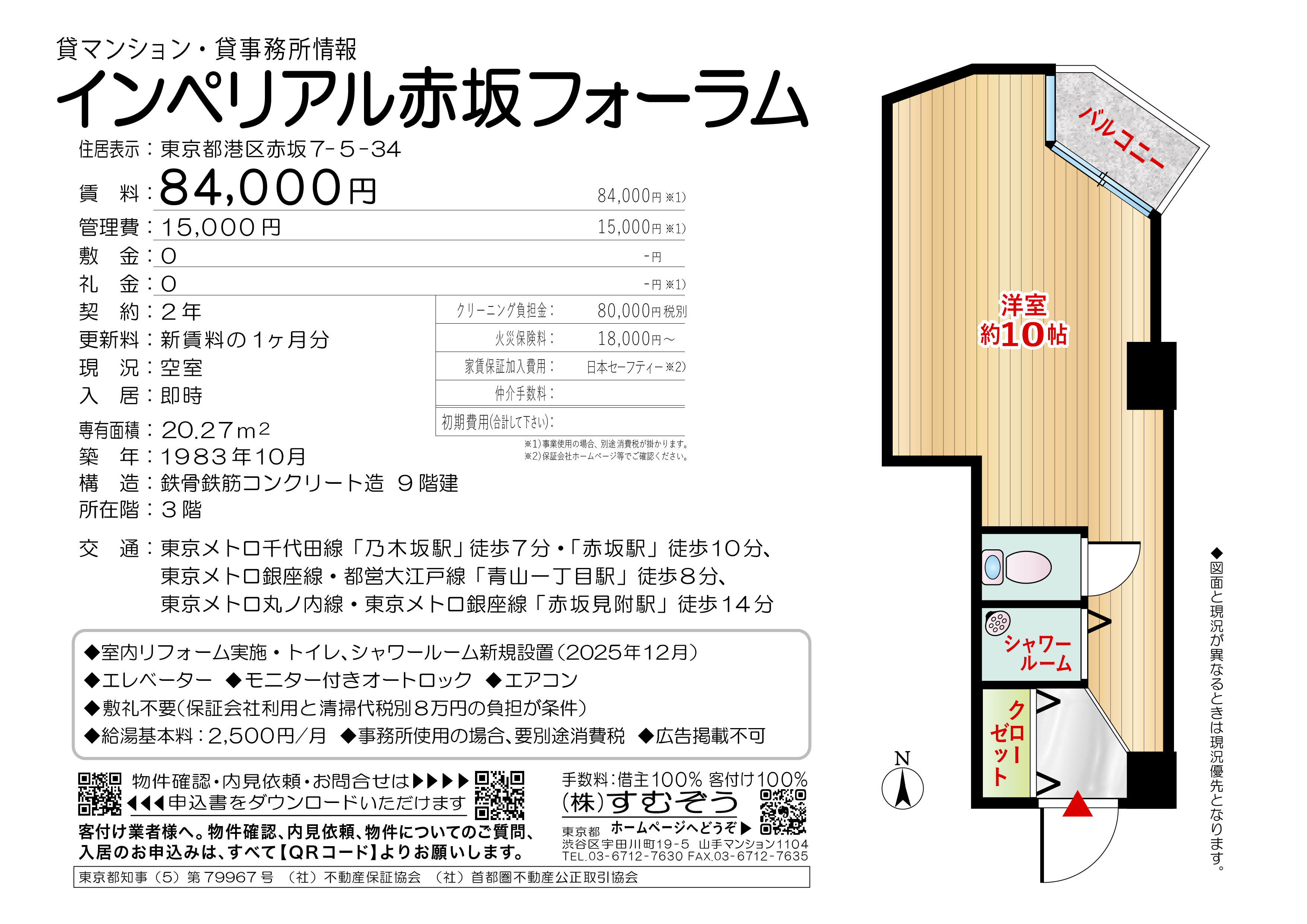 間取り:1R 専有面積:20.27㎡ 築年月:1983年10月 賃料:8.4万円