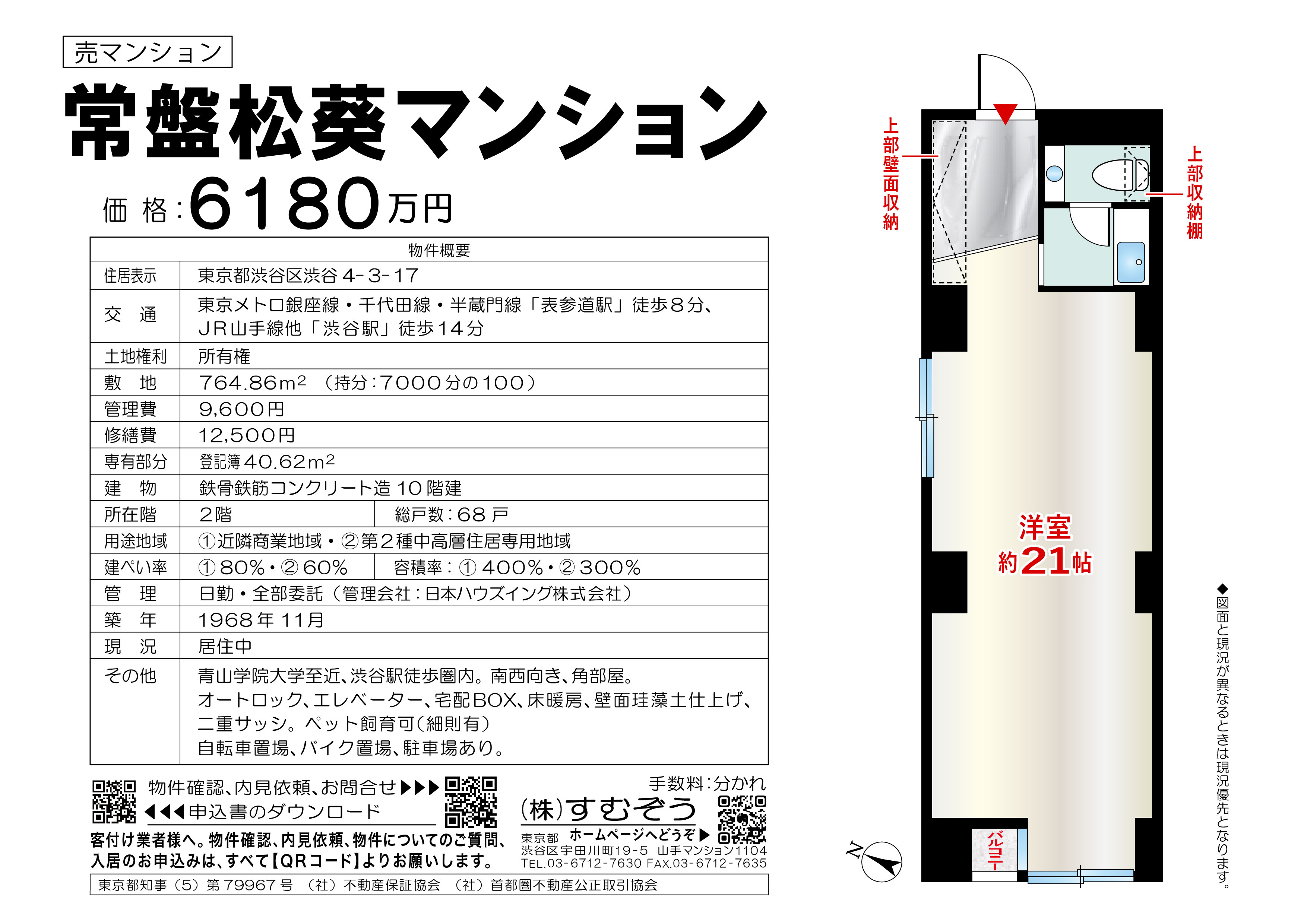 間取り:1R 専有面積:登記簿40.62㎡ 築年月:1968年11月 価格:6,180万円