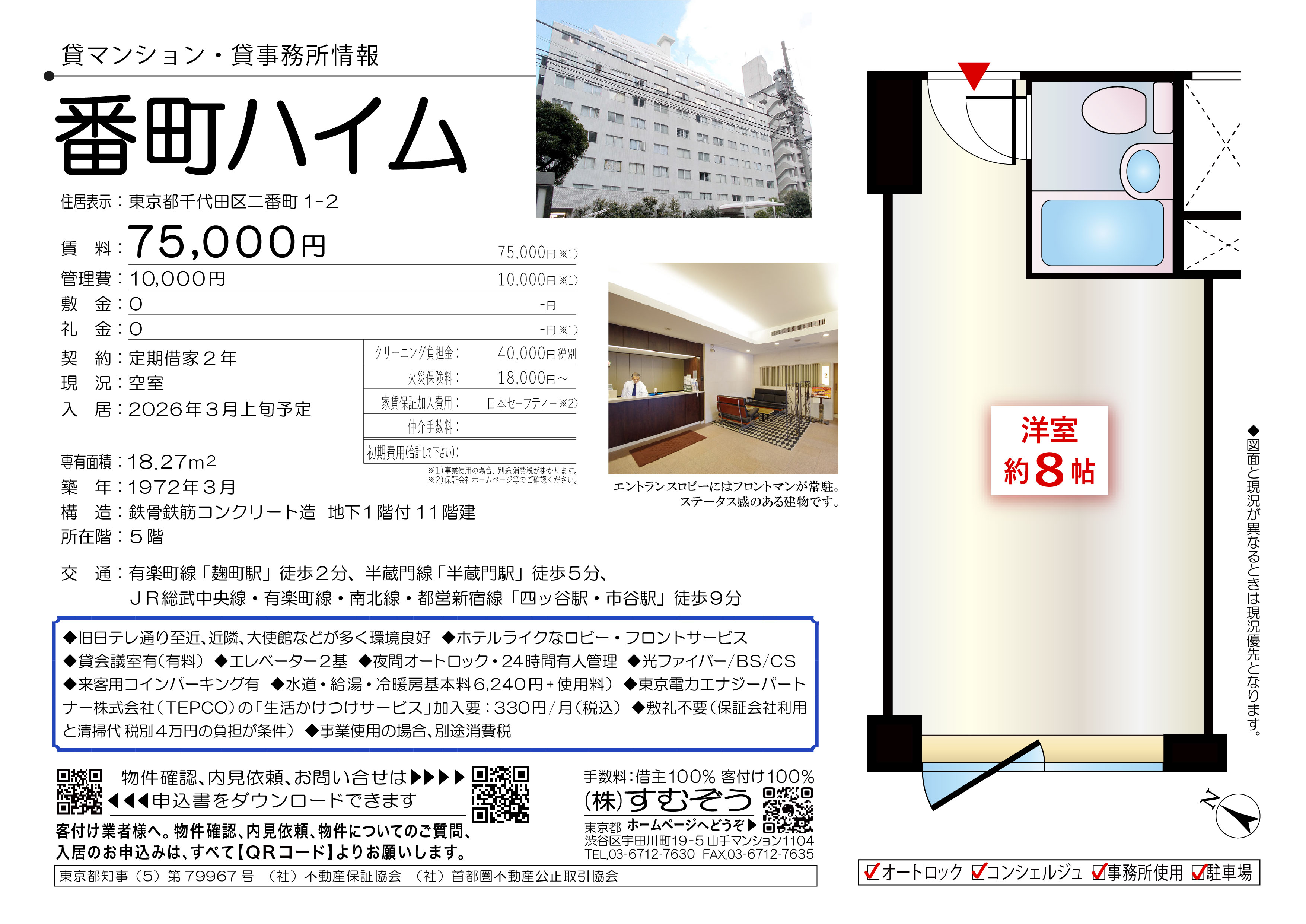 二番町ステイタスマンション・麹町2分 事務所OK 敷金礼金不要! 定期借家契約