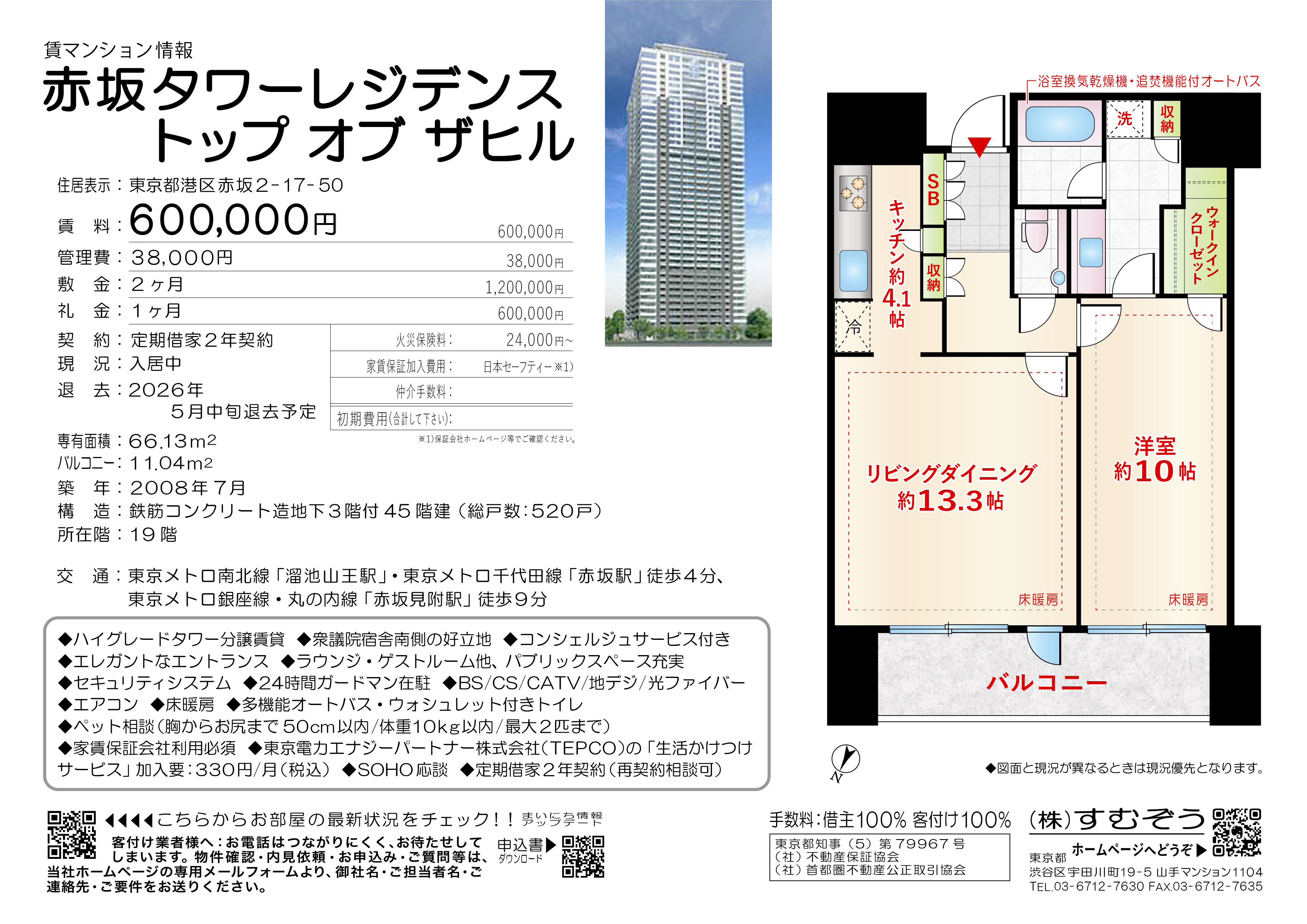 間取り:1SLDK 専有面積:66.13㎡ 築年月:2008年07月 賃料:60万円